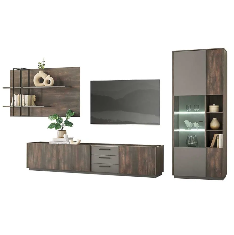Modernes Design für anspruchsvolle Wohnkultur Modernes Design bedeutet hier mehr als nur Optik. Die Kombination aus Hänge- und Stehformen schafft eine besondere Dynamik und setzt Ihre Einrichtung gekonnt in Szene. Zusätzlich sorgt der Materialmix aus Holzwerkstoff, Metall und Glas für einen aufregenden Look, der gleichzeitig edel und funktional ist. So entsteht eine Wohnwand, die nicht nur optisch überzeugt, sondern auch Ihren Alltag erleichtert.