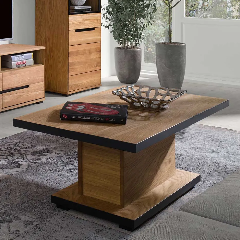 Entfalten Sie einen Hauch von Luxus in Ihrem Wohnzimmer mit dem Couchtisch „Sennya“. Geschickt gefertigt aus einer Kombination von Holzwerkstoff und hochwertigem Eichenholz, vermittelt dieser Tisch sowohl Robustheit als auch eine exquisite Ästhetik. Die Oberflächen sind mit einem Eiche Echtholzfurnier veredelt und sorgfältig geölt, wodurch die natürliche Maserung und Textur des Holzes hervorgehoben wird.