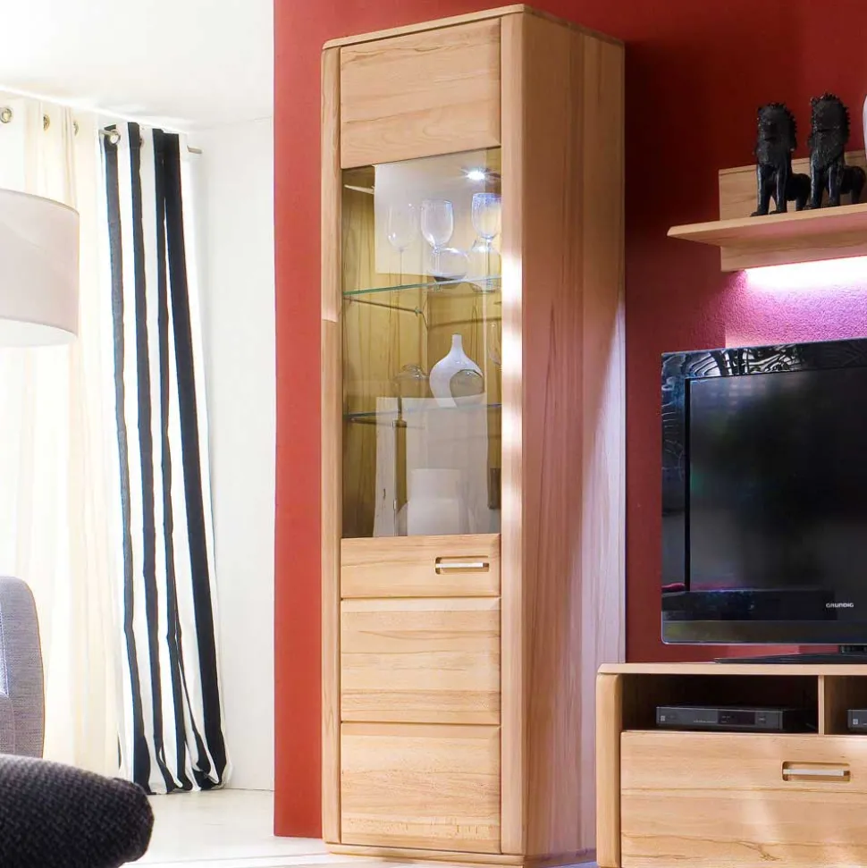 Der besondere Charakter der Vitrine „Athias“ wird durch die erlesene Materialauswahl erzeugt. Die Front besteht aus massiver Kernbuche, einem robusten, langlebigen und gleichzeitig ästhetisch ansprechenden Material. Die charakteristischen Maserungen und das warme, honigfarbene Holz der Kernbuche verleihen jedem Raum einen Hauch von Natur und Komfort. Der Korpus der Vitrine ist aus Spanplatte gefertigt und mit echtholzfurniert und geölt, was für ein harmonisches Gesamtbild sorgt.
