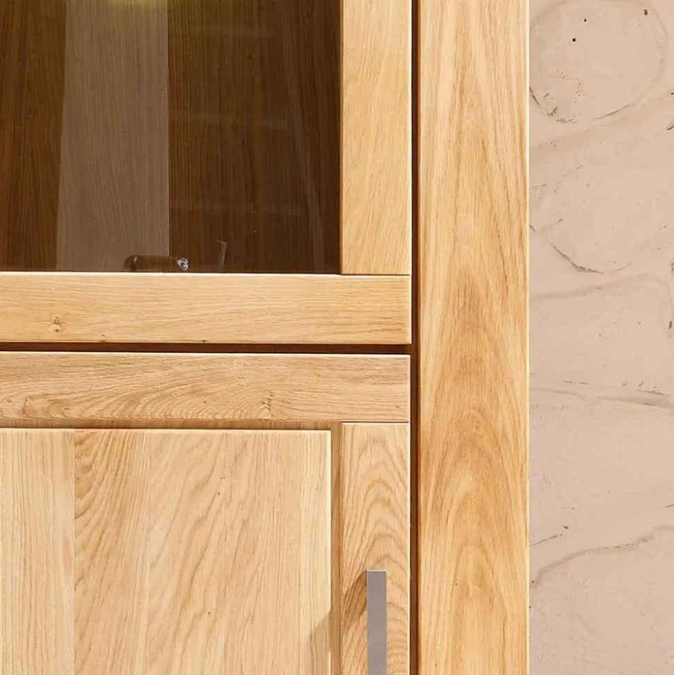 Die Wohnkombination „Ladressa“ wird aus massiver Wildeiche und Spanplatte gefertigt. Die Wildeiche zeichnet sich durch ihre besondere Festigkeit und Langlebigkeit aus. Ihre auffällige Maserung und warme Farbgebung sorgt für ein natürliches, wohnliches Gefühl.