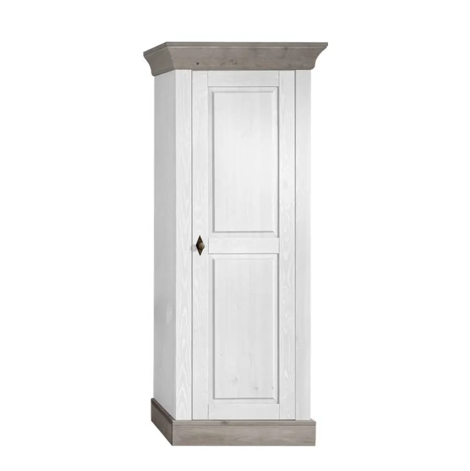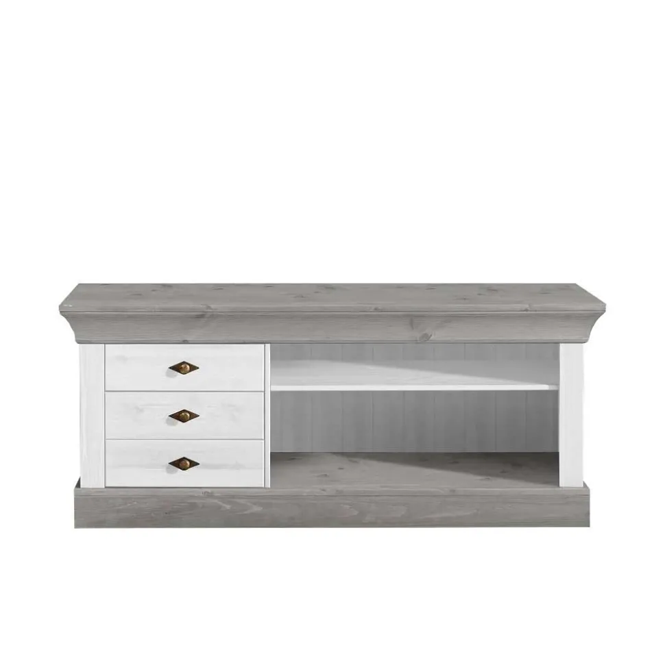 Das Hauptmaterial, massive nordische Kiefer, wird ergänzt durch Schubkastenrahmen, -böden und die Rückwand des Möbels aus stabilem Sperrholz. Die Oberflächen sind in Weiß lackiert, während Sockel und Oberplatten in einem ansprechenden Grau gehalten sind. Die durchscheinende Maserung unterstreicht die natürliche Schönheit des Holzes und die Vorteile der Lackierung: eine pflegeleichte und widerstandsfähige Oberfläche.