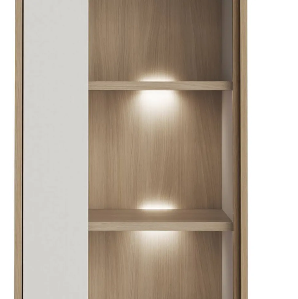 Zum Set gehören zwei identische Vitrinen (B/H/T: 58x195x39 cm), die wahlweise mit Türanschlag rechts oder links montiert werden können. Jede Vitrine verfügt über zwei Drehtüren, wobei der obere Bereich mit einem Glaseinsatz versehen ist. Drei Einlegeböden bieten Platz für Dekoration oder Sammlerstücke. Optional ist eine Variante mit LED-Beleuchtung erhältlich, die die Holzböden warmweiß illuminiert. Jede Vitrine wiegt ca. 51 kg und benötigt für die Sicherheit eine Kippsicherung an der Wand.