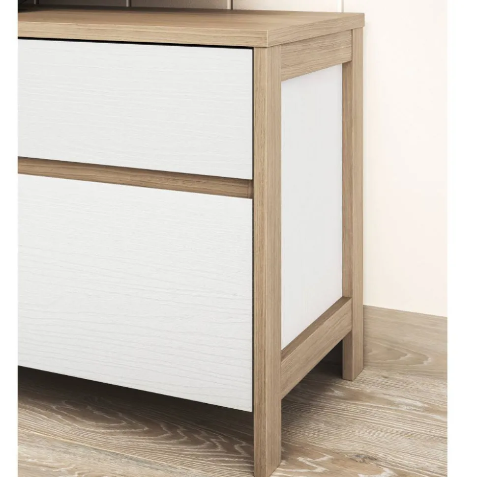 Gefertigt aus hochwertigem Holzwerkstoff überzeugt das Set durch Stabilität und ein angenehmes Erscheinungsbild. Die melaminbeschichteten Oberflächen in Eiche Natur und Weiß verbinden Optik mit praktischen Vorteilen: Sie sind kratzfest, unempfindlich gegenüber Feuchtigkeit und besonders leicht zu reinigen – ideal für den Alltag im Wohnzimmer. So bleiben Ihre Möbel auch bei täglicher Nutzung schön und gepflegt.