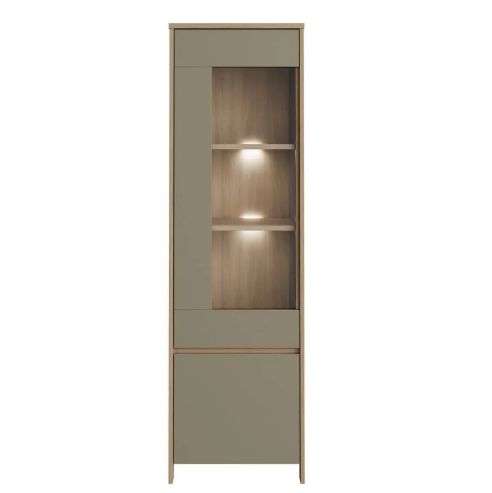Die Vitrine misst 58 cm in der Breite, 195 cm in der Höhe und 39 cm in der Tiefe. Zwei Drehtüren mit Glaseinsatz im oberen Bereich geben den Blick frei auf drei Einlegeböden – ideal für Dekoration oder Sammlerstücke. Der Türanschlag ist wahlweise rechts oder links montierbar. Gewicht: ca. 51 kg.