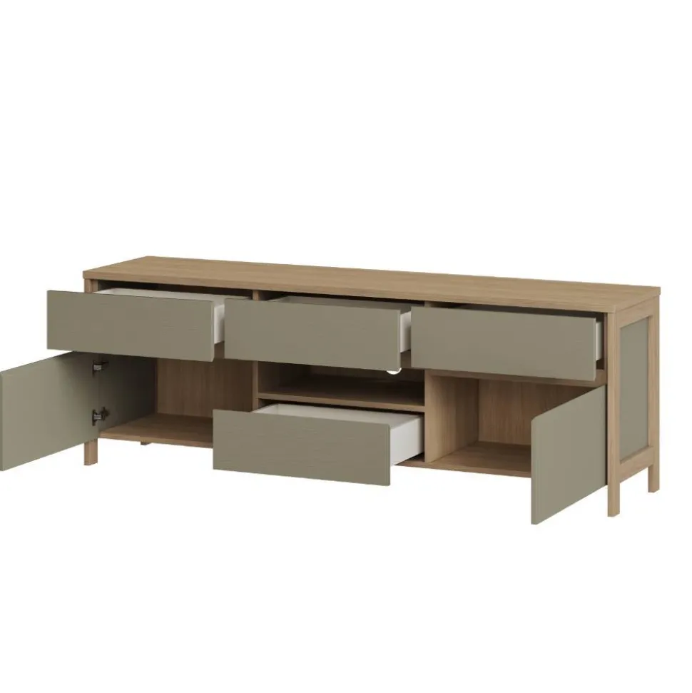 Mit Maßen von 164 cm Breite, 58 cm Höhe und 39 cm Tiefe bietet das TV-Board Platz für Ihre Unterhaltungselektronik und Zubehör. Vier Schubladen, zwei Drehtüren und ein offenes Gerätefach sorgen für Ordnung. Die Rückwand ist mit einer runden Öffnung versehen – für eine saubere Kabelführung. Hinter den Türen befindet sich jeweils ein Fach. Gewicht: ca. 49 kg.