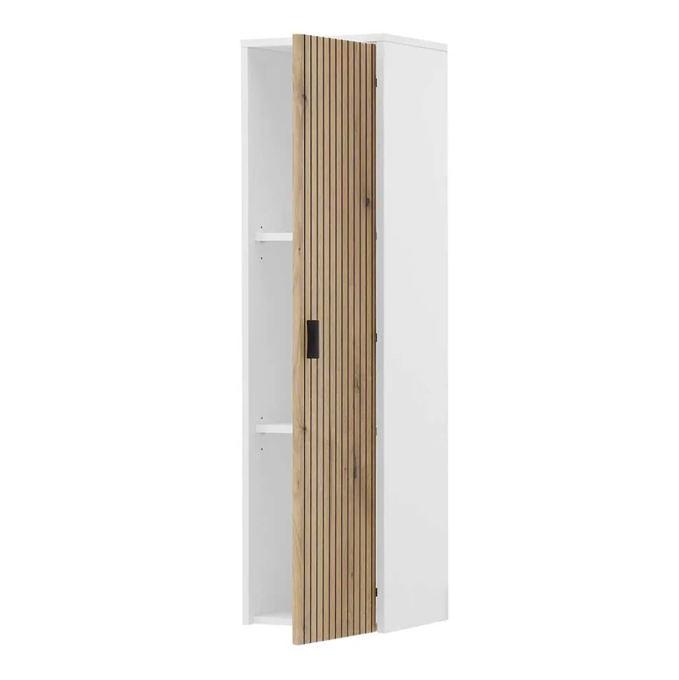 Die zwei Hängeschränke messen jeweils 33x120x30 cm und sind in ihrer Gestaltung einzigartig: Eine Tür-Front in Wildeiche Holzdekor mit vertikal verlaufenden Rillen ergänzt die weiße Türfront. Der Innenraum hinter den Türen ist durch zwei Einlegeböden in drei Fächer unterteilt. Die Türen können flexibel rechts oder links am Korpus montiert werden.