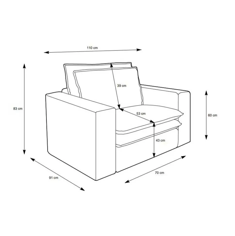 Dieses Möbelstück zeichnet sich nicht nur durch sein ästhetisches Design aus, sondern auch durch seine hohe Funktionalität. Der Sessel mit Maßen von 110x83x91 cm bietet eine Sitzhöhe von 43 cm und eine großzügige Sitztiefe von 53 cm. Die Armlehnen, jeweils 60 cm hoch und 20 cm breit, verleihen dem Sessel zusätzlichen Komfort. Mit einem kleinen und einem großen losen Rückenkissen sowie einer maximalen Belastbarkeit von 150 kg ist dieser Sessel perfekt für entspannte Stunden geeignet. Der Rücken ist echt bezogen, was es ermöglicht, den Sessel frei im Raum zu platzieren.