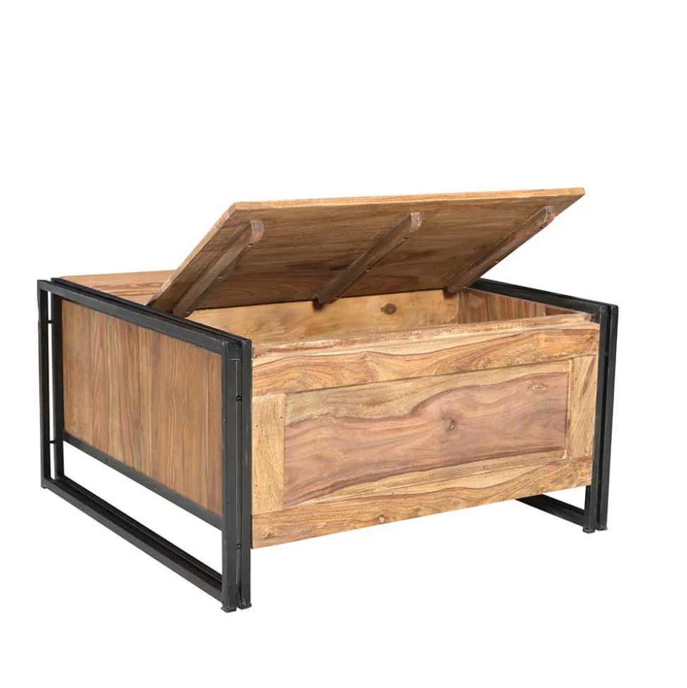 Mit einer Breite von 90 cm, einer Höhe von 47 cm und einer Tiefe von 90 cm bietet der „Mendoza“ nicht nur eine großzügige Abstellfläche, sondern auch jede Menge Stauraum. Zwei große und drei kleinere Schubladen, ausgestattet mit antikschwarz-lackierten Metallfronten und Holzauszug, bieten Platz für die kleinen Dinge des Alltags. Schicke Klappgriffe aus Metall erleichtern das Öffnen und Schließen. Ein zusätzliches Truhenfach, zu öffnen und schließen an der Tischplattenoberseite, stellt weiteren, praktischen Stauraum bereit.