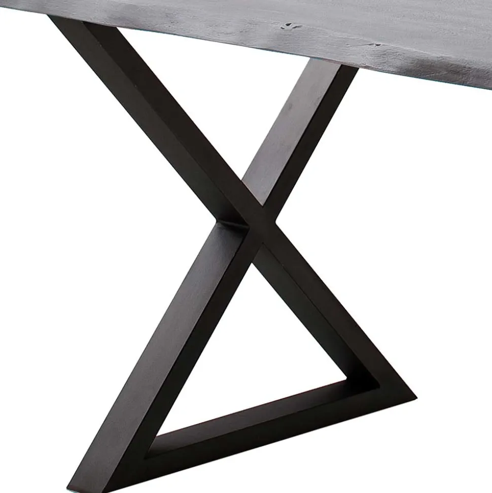 Das Designgestell des „Mudena“ besteht aus zwei X-Beinen aus anthrazitfarben lackiertem Metall. Diese bieten nicht nur eine breite und stabile Auflagefläche, sondern setzen auch einen modernen Akzent. Die Kombination aus Holz und Metall unterstreicht den industriellen Charakter des Tisches und macht ihn zu einem echten Hingucker.