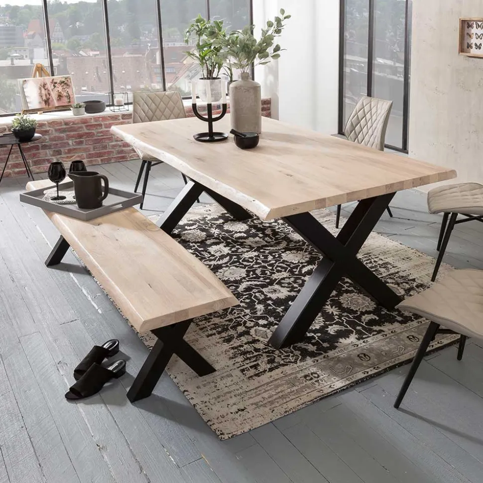 Die Bank und der Tisch der „Tilveta“-Sitzgruppe zeichnen sich durch eine Kombination aus massivem Eichenholz und hochwertigem Metall aus. Diese Kombination ist nicht nur optisch ein Genuss, sondern auch besonders stabil und langlebig.