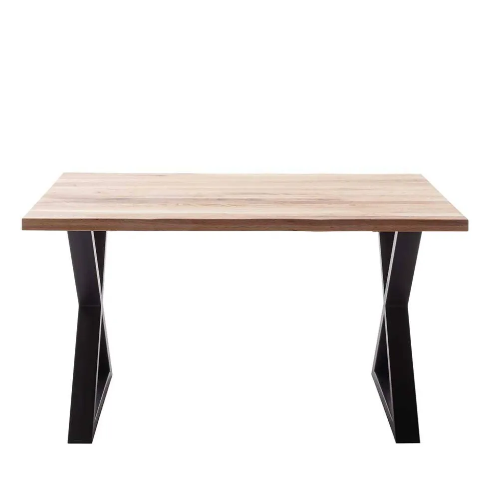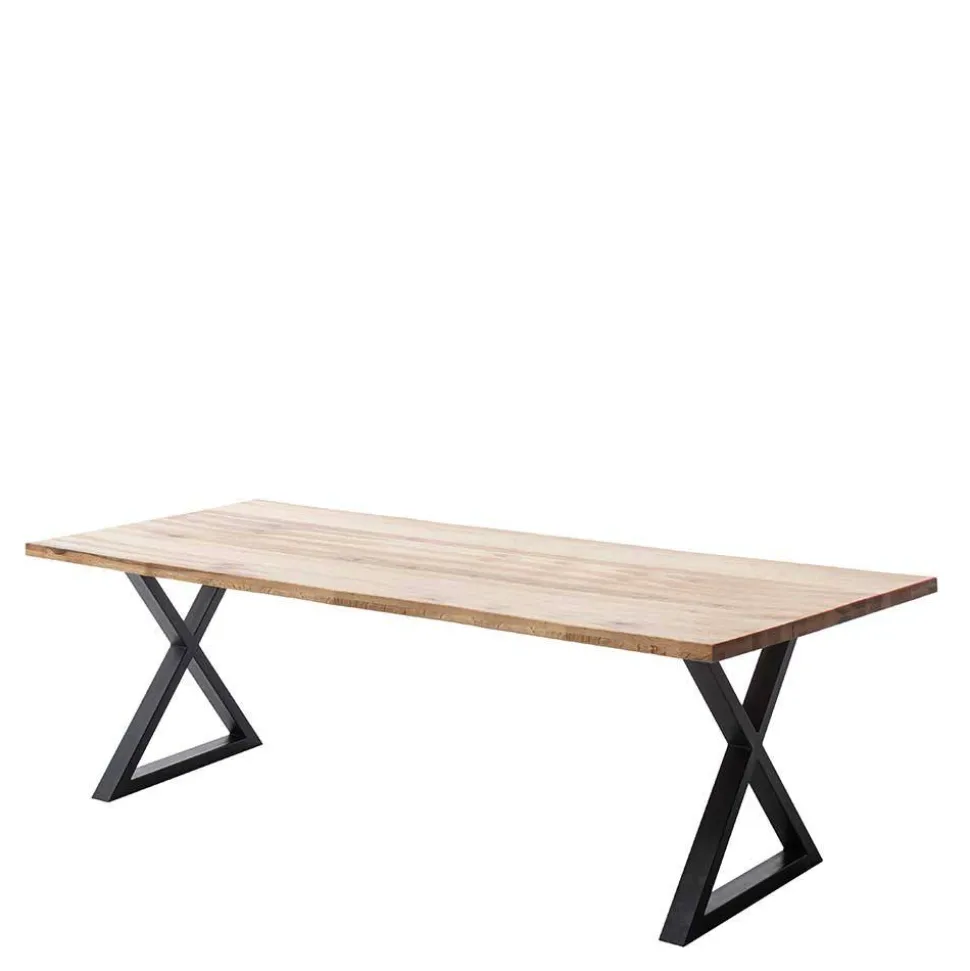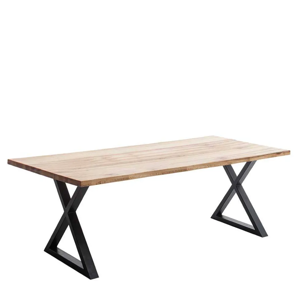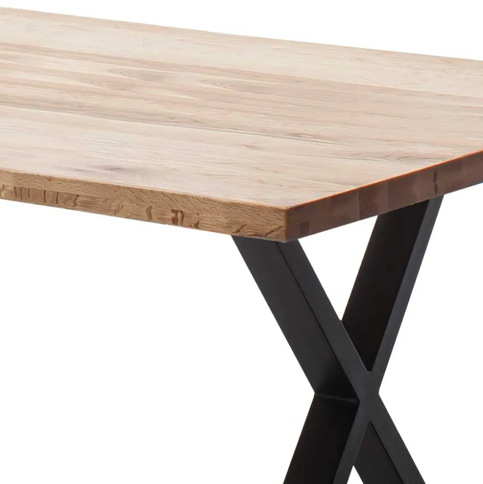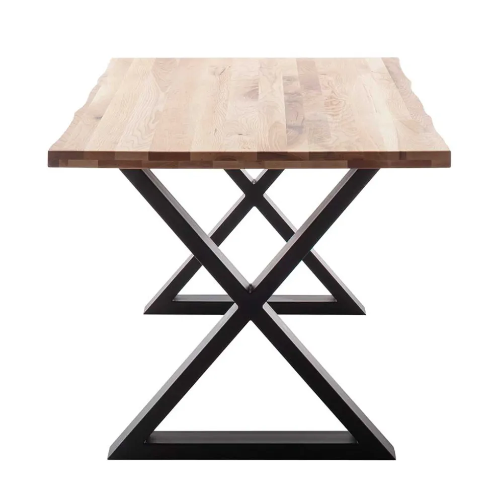 Die Tischplatte des „Yelna“ besteht aus sorgfältig verarbeitetem Zerreiche Massivholz in Lamellenverarbeitung. Zum Schutz und für eine einfache Pflege sind die Massivholzoberflächen geölt. Die markanten X-Füße aus Metall sind mit einer schwarzen Pulverbeschichtung versehen und garantieren Stabilität und Langlebigkeit.