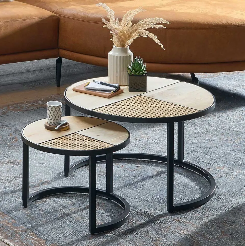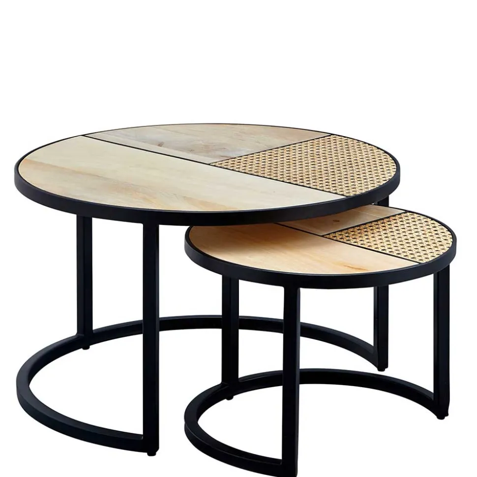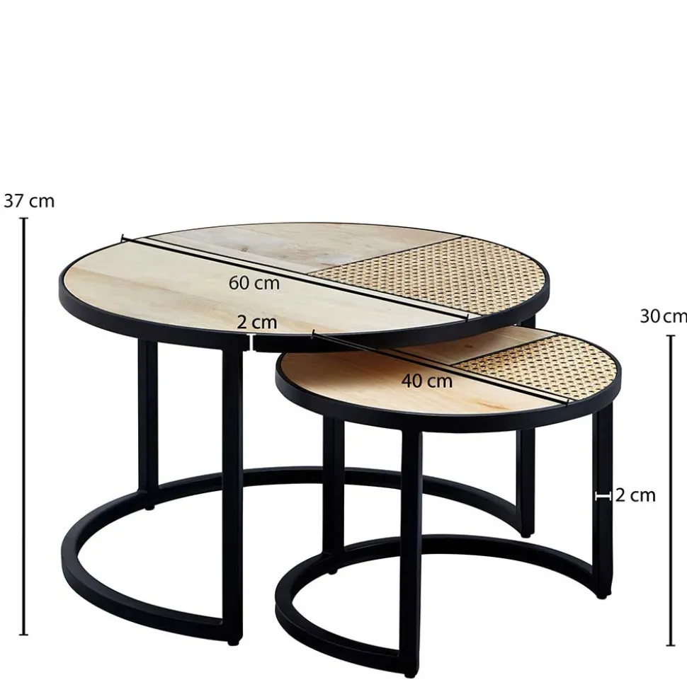 Die runden Formen der beiden Tische wirken harmonisch und elegant. Das größere Modell misst 60x37x60 cm, das kleinere 40x30x40 cm – beide lassen sich dank halbseitig offener Metall-Ringgestelle platzsparend ineinander schieben. Die Tischplatten kombinieren edles Mangoholz mit feinem Rattan-Geflecht, das für einen leichten, natürlichen Akzent sorgt. Mit einer Belastbarkeit von 15 kg beim großen Tisch und 10 kg beim kleinen ist das Set ebenso funktional wie dekorativ.